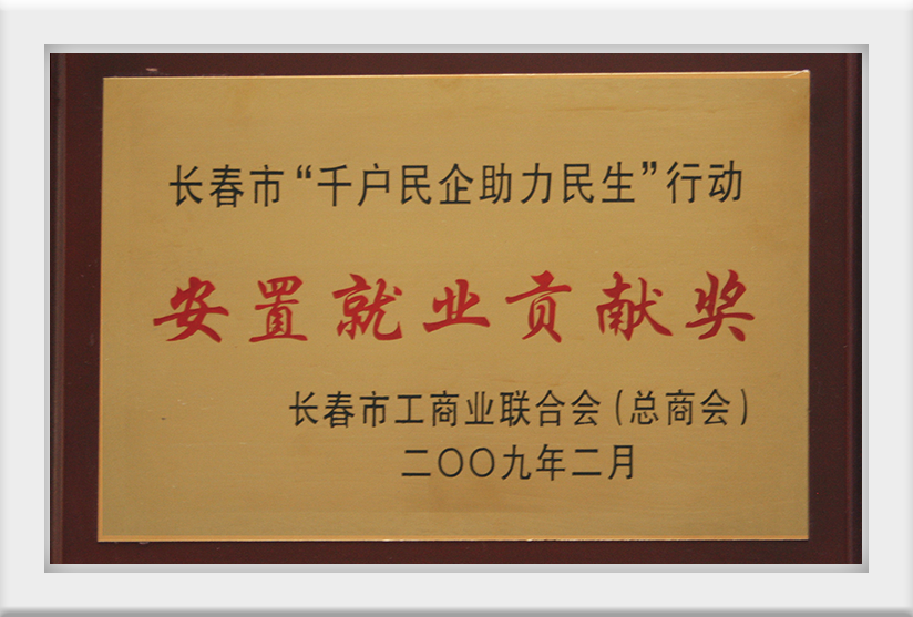 2009年2月榮獲長春市“千戶民企助力民生”行動安置就業(yè)貢獻獎