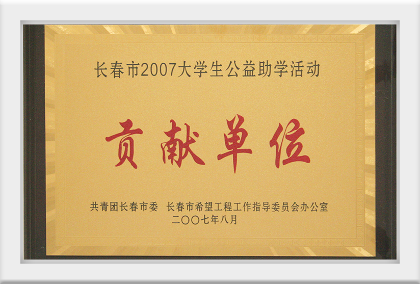2007年8月榮獲長春市2007大學(xué)生公益助學(xué)活動貢獻單位